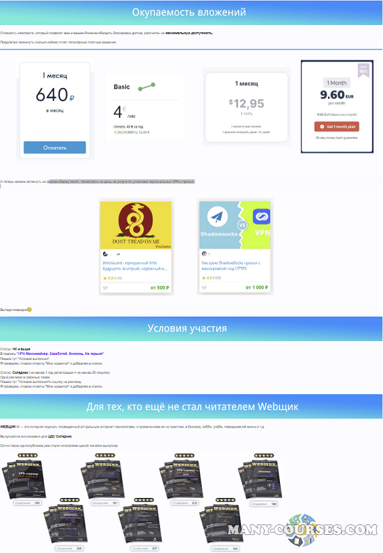 Вы находитесь на странице товара «Webщик - VPN Максимайзер: Зарабатывай. Экономь. Не парься», это материал 2022 года, который, мы надеемся, принесет вам пользу. Данный курс расположен на платформе «Облако Mail».Скриншоты с платформы на которой расположены материалы вы можете найти выше. В нашем магазине курсы доступны по самым выгодным ценам. Вы можете перейти на оригинальный продажник, после чего принять решение о покупке. Вы получаете этот курс, купив в нашем магазине MANY-COURSES.NET, с огромной скидкой, всего 149 рублей. Обучающий курс входит в рубрику «Бизнес, менеджмент, продажи / Схемы заработка», вы можете поискать другие сливы курсов в этой рубрике. В нашем магазине Вы найдёте ещё много курсов от автора «Webщик», достаточно ввести в поиск имя автора.
