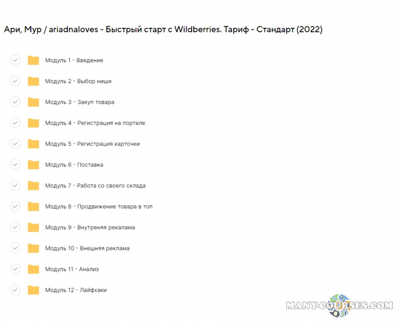 Вы находитесь на странице товара «Ари, Мур / ariadnaloves - Быстрый старт с Wildberries. Тариф - Стандарт», это материал 2022 года, который, мы надеемся, принесет вам пользу. Данный курс расположен на платформе «Облако Mail».Скриншоты с платформы на которой расположены материалы вы можете найти выше. В нашем магазине курсы доступны по самым выгодным ценам. Вы можете перейти на оригинальный продажник, после чего принять решение о покупке. Вы получаете этот курс, купив в нашем магазине MANY-COURSES.NET, с огромной скидкой, всего 630 рублей. Обучающий курс входит в рубрику «Бизнес, менеджмент, продажи / Wildberries», вы можете поискать другие сливы курсов в этой рубрике. В нашем магазине Вы найдёте ещё много курсов от автора «Ари, Мур», достаточно ввести в поиск имя автора.