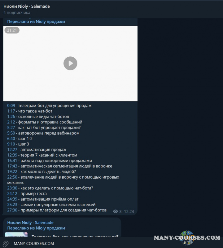 Вы находитесь на странице товара «Ниоли Nioly - Salemade Курс по продаже своих услуг», это материал 2022 года, который, мы надеемся, принесет вам пользу. Данный курс расположен на платформе «Канал Telegram».Скриншоты с платформы на которой расположены материалы вы можете найти выше. В нашем магазине курсы доступны по самым выгодным ценам. Вы можете перейти на оригинальный продажник, после чего принять решение о покупке. Если бы вы покупали у самого автора, то данный курс вам обошелся 20000 рублей. Вы получаете этот курс, купив в нашем магазине MANY-COURSES.NET, с огромной скидкой, всего 900 рублей. Обучающий курс входит в рубрику «Бизнес, менеджмент, продажи», вы можете поискать другие сливы курсов в этой рубрике. В нашем магазине Вы найдёте ещё много курсов от автора «Ниоли Nioly», достаточно ввести в поиск имя автора.