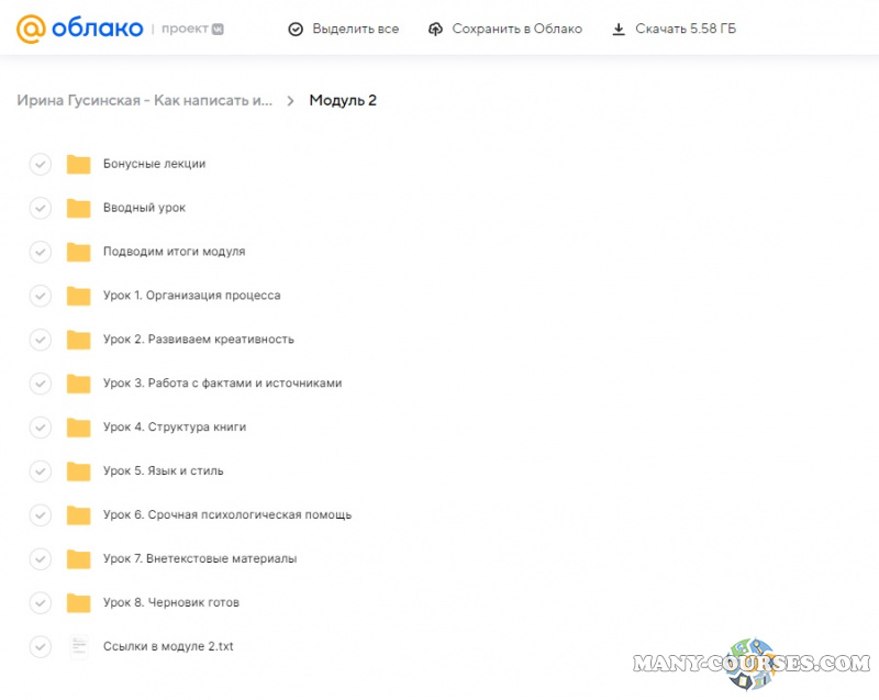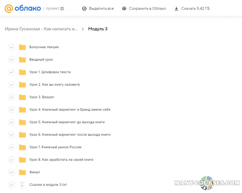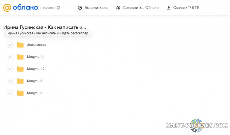 Вы находитесь на странице товара «Ирина Гусинская - Как написать и издать бестселлер. Полный курс», это материал 2022 года, который, мы надеемся, принесет вам пользу. Данный курс расположен на платформе «Облако Mail».Скриншоты с платформы на которой расположены материалы вы можете найти выше. В нашем магазине курсы доступны по самым выгодным ценам. Вы можете перейти на оригинальный продажник, после чего принять решение о покупке. Если бы вы покупали у самого автора, то данный курс вам обошелся 99990 рублей. Вы получаете этот курс, купив в нашем магазине MANY-COURSES.NET, с огромной скидкой, всего 990 рублей. Обучающий курс входит в рубрику «Бизнес, менеджмент, продажи / Саморазвитие и мотивация», вы можете поискать другие сливы курсов в этой рубрике. В нашем магазине Вы найдёте ещё много курсов от автора «Ирина Гусинская», достаточно ввести в поиск имя автора.