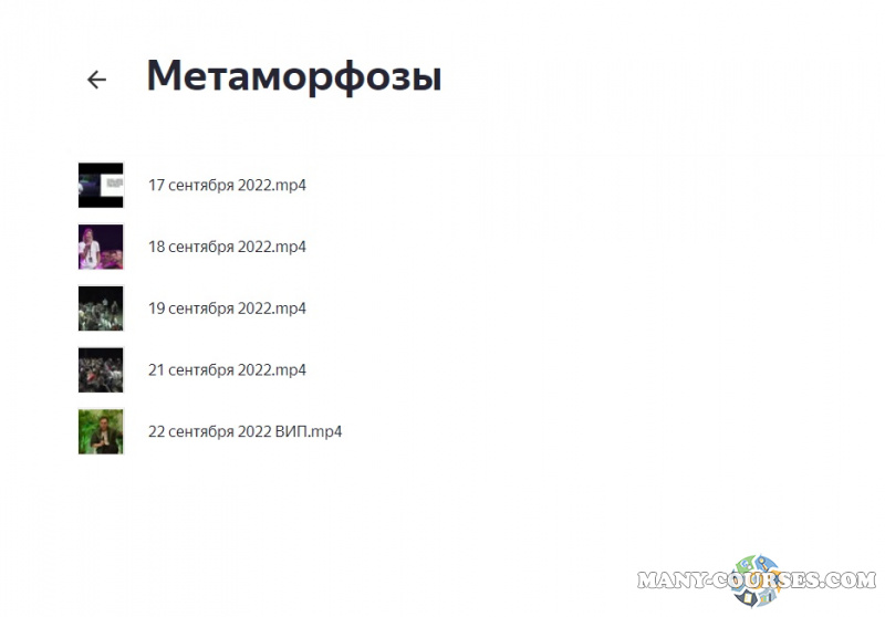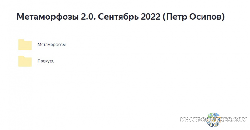 Вы находитесь на странице товара «Петр Осипов - Метаморфозы 2.0. Москва. Сентябрь 2022. Тариф Premium», это материал 2022 года, который, мы надеемся, принесет вам пользу. Данный курс расположен на платформе «Яндекс Диск».Скриншоты с платформы на которой расположены материалы вы можете найти выше. В нашем магазине курсы доступны по самым выгодным ценам. Вы можете перейти на оригинальный продажник, после чего принять решение о покупке. Если бы вы покупали у самого автора, то данный курс вам обошелся 350000 рублей. Вы получаете этот курс, купив в нашем магазине MANY-COURSES.NET, с огромной скидкой, всего 790 рублей. Обучающий курс входит в рубрику «Бизнес, менеджмент, продажи / Эзотерика и оккультизм / Психология», вы можете поискать другие сливы курсов в этой рубрике. В нашем магазине Вы найдёте ещё много курсов от автора «Петр Осипов», достаточно ввести в поиск имя автора.
