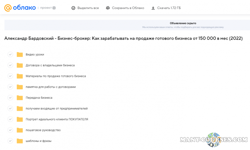 Вы находитесь на странице товара «Александр Бардовский - Бизнес-брокер: Как зарабатывать на продаже готового бизнеса от 150 000 в мес», это материал 2022 года, который, мы надеемся, принесет вам пользу. Данный курс расположен на платформе «Облако Mail».Скриншоты с платформы на которой расположены материалы вы можете найти выше. В нашем магазине курсы доступны по самым выгодным ценам. Вы получаете этот курс, купив в нашем магазине MANY-COURSES.NET, с огромной скидкой, всего 300 рублей. Обучающий курс входит в рубрику «Бизнес, менеджмент, продажи / Схемы заработка», вы можете поискать другие сливы курсов в этой рубрике. В нашем магазине Вы найдёте ещё много курсов от автора «Александр Бардовский», достаточно ввести в поиск имя автора.