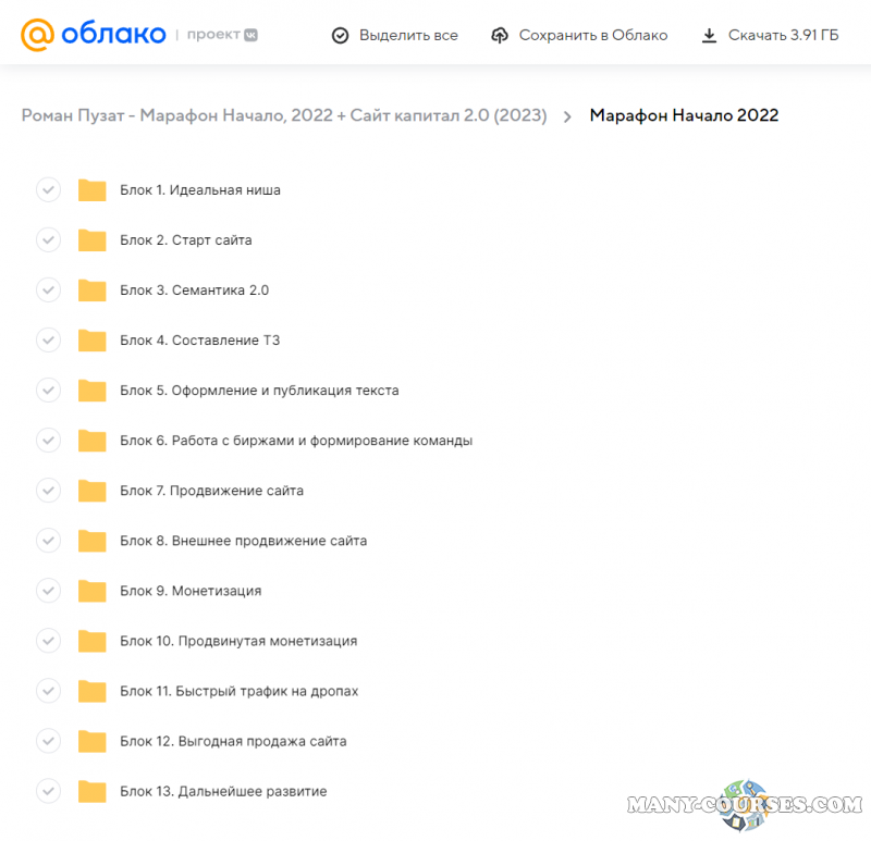 Вы находитесь на странице товара «Роман Пузат - Марафон Начало, 2022 + Сайт капитал 2.0», это материал 2022 года, который, мы надеемся, принесет вам пользу. Данный курс расположен на платформе «Облако Mail».Скриншоты с платформы на которой расположены материалы вы можете найти выше. В нашем магазине курсы доступны по самым выгодным ценам. Вы можете перейти на оригинальный продажник, после чего принять решение о покупке. Вы получаете этот курс, купив в нашем магазине MANY-COURSES.NET, с огромной скидкой, всего 590 рублей. Обучающий курс входит в рубрику «Бизнес, менеджмент, продажи / Создание сайтов», вы можете поискать другие сливы курсов в этой рубрике. В нашем магазине Вы найдёте ещё много курсов от автора «Роман Пузат», достаточно ввести в поиск имя автора.