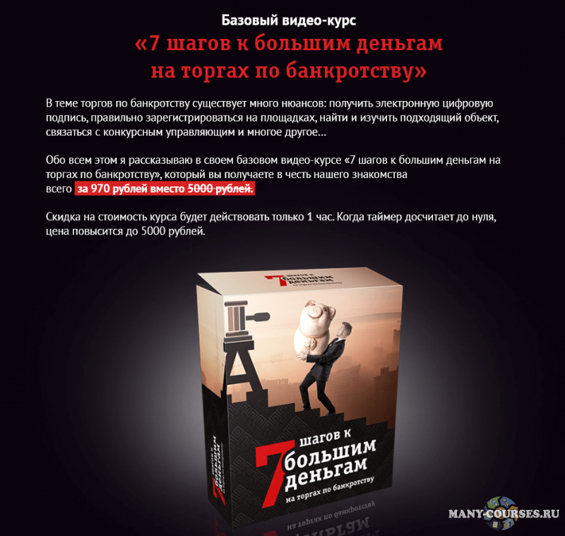 Вы находитесь на странице товара «Torgi-vatson - 7 шагов к большим деньгами на торгах по банкротству», это материал 2021 года, который, мы надеемся, принесет вам пользу. Скриншоты с платформы на которой расположены материалы вы можете найти выше. В нашем магазине курсы доступны по самым выгодным ценам. Вы можете перейти на оригинальный продажник, после чего принять решение о покупке. Если бы вы покупали у самого автора, то данный курс вам обошелся 970 рублей. Вы получаете этот курс, купив в нашем магазине MANY-COURSES.NET, с огромной скидкой, всего 99 рублей. Обучающий курс входит в рубрику «Бизнес, менеджмент, продажи», вы можете поискать другие сливы курсов в этой рубрике. В нашем магазине Вы найдёте ещё много курсов от автора «Torgi-vatson», достаточно ввести в поиск имя автора.