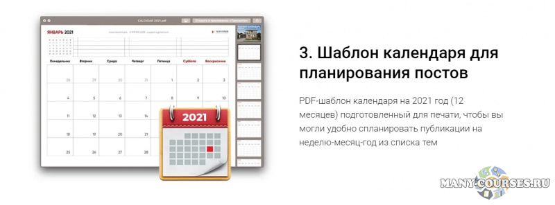 PDF-шаблон календаря на 2021 год (12 месяцев) подготовленный для печати, чтобы вы могли удобно спланировать публикации на неделю-месяц-год из списка тем