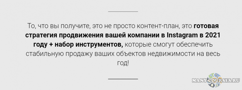 То, что вы получите, это не просто контент-план, это готовая стратегия продвижения вашей компании в Instagram в 2021 году + набор инструментов, которые смогут обеспечить стабильную продажу ваших объектов недвижимости на весь год!