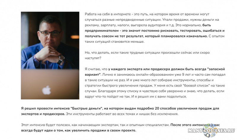 Я решил провести интенсив "Быстрые деньги", на котором выдам подробно 20 способов увеличения продаж для экспертов и продюсеров. Эти инструменты работают во всех темах и нишах без исключения.