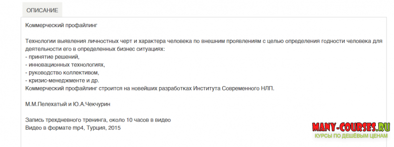Вы находитесь на странице товара «Михаил Пелехатый и Юрий Чекчурин - Бизнес профайлинг», это материал 2021 года, который, мы надеемся, принесет вам пользу. Данный курс расположен на платформе «Облако Mail».Скриншоты с платформы на которой расположены материалы вы можете найти выше. В нашем магазине курсы доступны по самым выгодным ценам. Вы можете перейти на оригинальный продажник, после чего принять решение о покупке. Если бы вы покупали у самого автора, то данный курс вам обошелся 999 рублей. Вы получаете этот курс, купив в нашем магазине MANY-COURSES.NET, с огромной скидкой, всего 49 рублей. Обучающий курс входит в рубрику «Бизнес, менеджмент, продажи», вы можете поискать другие сливы курсов в этой рубрике. В нашем магазине Вы найдёте ещё много курсов от автора «Михаил Пелехатый и Юрий Чекчурин», достаточно ввести в поиск имя автора.
