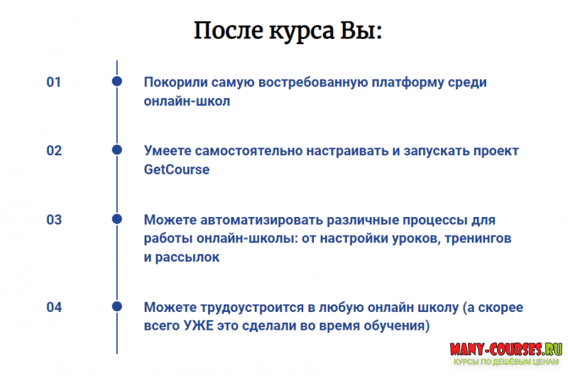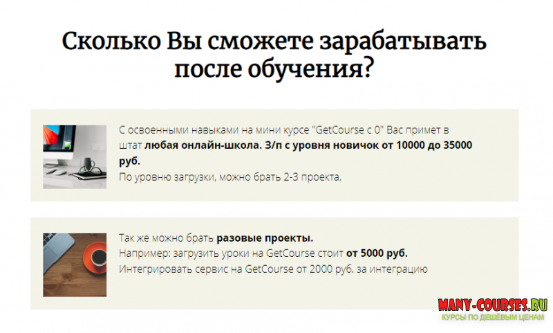 1. С освоенными навыками на мини курсе "GetCourse с 0" Вас примет в штат любая онлайн-школа. З/п с уровня новичок от 10000 до 35000 руб.