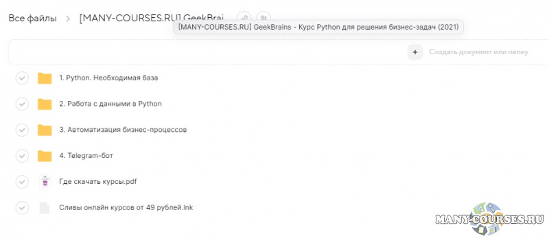 Вы находитесь на странице товара «GeekBrains - Курс Python для решения бизнес-задач», это материал 2021 года, который, мы надеемся, принесет вам пользу. Данный курс расположен на платформе «Облако Mail».Скриншоты с платформы на которой расположены материалы вы можете найти выше. В нашем магазине курсы доступны по самым выгодным ценам. Вы можете перейти на оригинальный продажник, после чего принять решение о покупке. Если бы вы покупали у самого автора, то данный курс вам обошелся 17150 рублей. Вы получаете этот курс, купив в нашем магазине MANY-COURSES.NET, с огромной скидкой, всего 149 рублей. Обучающий курс входит в рубрику «Бизнес, менеджмент, продажи / Программирование / SEO и SMM», вы можете поискать другие сливы курсов в этой рубрике. В нашем магазине Вы найдёте ещё много курсов от автора «Иван Пятернев», достаточно ввести в поиск имя автора.