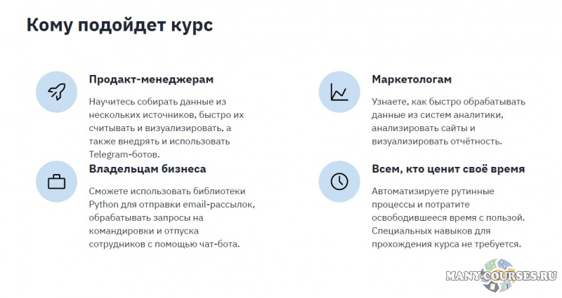 Курс рекомендуется продакт-менеджерам, маркетологам и владельцам бизнеса. Вы научитесь обрабатывать данные и автоматизировать рутинные процессы с помощью Python. Узнаете, как быстро персонализировать рассылки и парсить сайты. Это позволит сократить время на сбор, обработку и проверку информации.