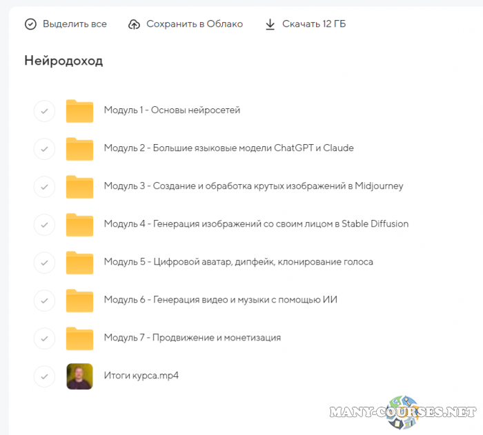 Вы находитесь на странице товара «Николай Волосянков - Нейродоход. Тариф Базовый», это материал 2024 года, который, мы надеемся, принесет вам пользу. Данный курс расположен на платформе «Облако Mail».Скриншоты с платформы на которой расположены материалы вы можете найти выше. В нашем магазине курсы доступны по самым выгодным ценам. Вы получаете этот курс, купив в нашем магазине MANY-COURSES.NET, с огромной скидкой, всего 490 рублей. Обучающий курс входит в рубрику «Нейросети / SEO и SMM», вы можете поискать другие сливы курсов в этой рубрике. В нашем магазине Вы найдёте ещё много курсов от автора «Николай Волосянков», достаточно ввести в поиск имя автора.