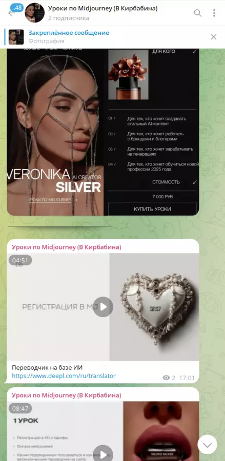 Вы находитесь на странице товара «Вероника Кирбабина - Уроки по Midjourney», это материал 2025 года, который, мы надеемся, принесет вам пользу. Данный курс расположен на платформе «Канал Telegram».Скриншоты с платформы на которой расположены материалы вы можете найти выше. В нашем магазине курсы доступны по самым выгодным ценам. Если бы вы покупали у самого автора, то данный курс вам обошелся 7000 рублей. Вы получаете этот курс, купив в нашем магазине MANY-COURSES.NET, с огромной скидкой, всего 790 рублей. Обучающий курс входит в рубрику «Нейросети», вы можете поискать другие сливы курсов в этой рубрике. В нашем магазине Вы найдёте ещё много курсов от автора «Вероника Кирбабина», достаточно ввести в поиск имя автора.