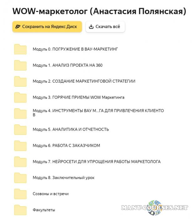 Вы находитесь на странице товара «Анастасия Полянская - WOW-маркетолог. Поток 6. Тариф PRO (2025)», это материал 2025 года, который, мы надеемся, принесет вам пользу. Данный курс расположен на платформе «Яндекс Диск».Скриншоты с платформы на которой расположены материалы вы можете найти выше. В нашем магазине курсы доступны по самым выгодным ценам. Вы можете перейти на оригинальный продажник, после чего принять решение о покупке. Вы получаете этот курс, купив в нашем магазине MANY-COURSES.NET, с огромной скидкой, всего 4990 рублей. Обучающий курс входит в рубрику «Реклама и маркетинг / SEO и SMM», вы можете поискать другие сливы курсов в этой рубрике. В нашем магазине Вы найдёте ещё много курсов от автора «Анастасия Полянская», достаточно ввести в поиск имя автора.