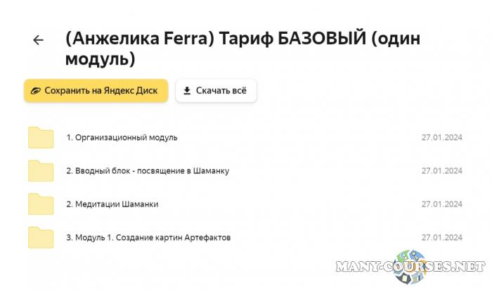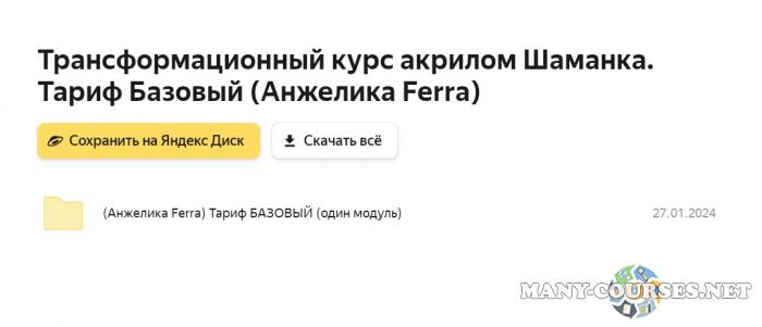 Вы находитесь на странице товара «Анжелика Ferra - Трансформационный курс акрилом Шаманка. Тариф Базовый», это материал 2022 года, который, мы надеемся, принесет вам пользу. Данный курс расположен на платформе «Яндекс Диск».Скриншоты с платформы на которой расположены материалы вы можете найти выше. В нашем магазине курсы доступны по самым выгодным ценам. Вы можете перейти на оригинальный продажник, после чего принять решение о покупке. Если бы вы покупали у самого автора, то данный курс вам обошелся 33800 рублей. Вы получаете этот курс, купив в нашем магазине MANY-COURSES.NET, с огромной скидкой, всего 500 рублей. Обучающий курс входит в рубрику «Графика и Дизайн / Эзотерика и оккультизм», вы можете поискать другие сливы курсов в этой рубрике. В нашем магазине Вы найдёте ещё много курсов от автора «Анжелика Ferra», достаточно ввести в поиск имя автора.