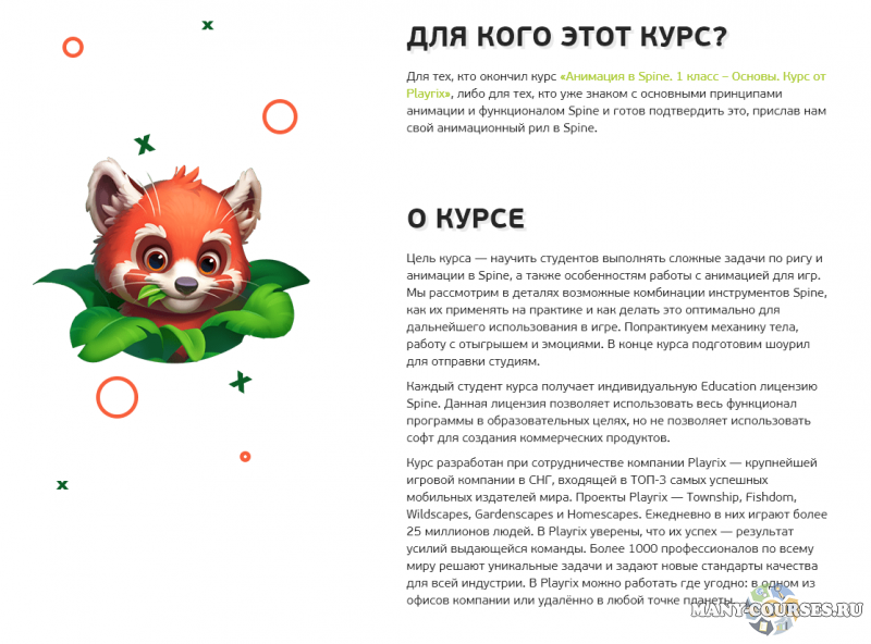 Курс разработан при сотрудничестве компании Playrix — крупнейшей игровой компании в СНГ, входящей в ТОП-5 самых успешных мобильных издателей мира. Проекты Playrix — Township, Fishdom, Wildscapes, Gardenscapes и Homescapes. Ежедневно в них играют более 25 миллионов людей. В Playrix уверены, что их успех — результат усилий выдающейся команды. Более 1000 профессионалов по всему миру решают уникальные задачи и задают новые стандарты качества для всей индустрии. В Playrix можно работать где угодно: в одном из офисов компании или удалённо в любой точке планеты.
