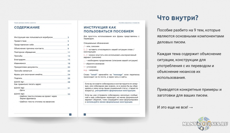 - Писать профессионально: В пособии объяснены нюансы коммуникации на английском языке: когда и как использовать какую фразу и конструкцию. Больше не будет не ловкости и недопонимания.