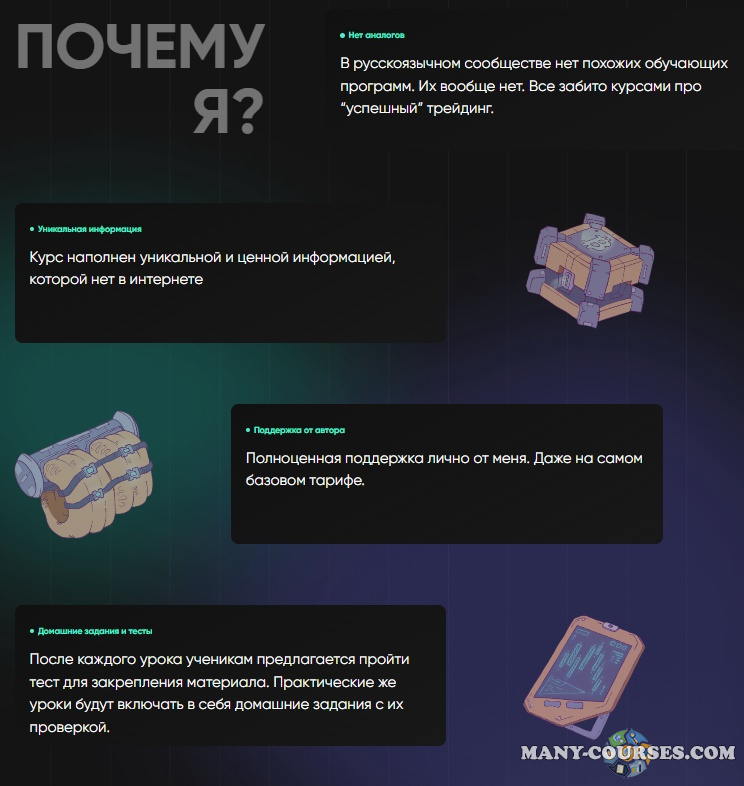 В русскоязычном сообществе нет похожих обучающих программ. Их вообще нет. Все забито курсами про “успешный” трейдинг.