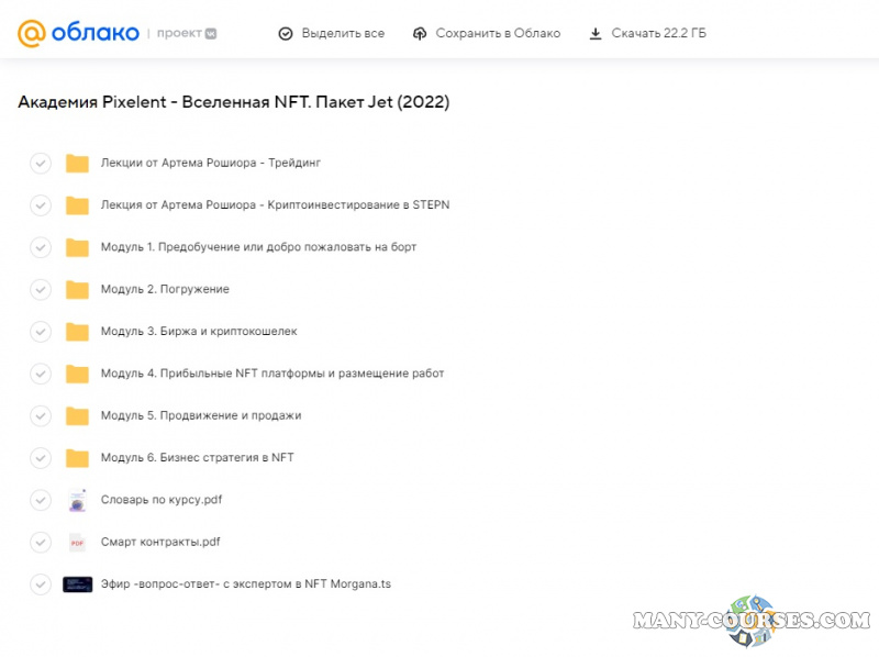 Вы находитесь на странице товара «Академия Pixelent - Вселенная NFT. Пакет Jet», это материал 2022 года, который, мы надеемся, принесет вам пользу. Данный курс расположен на платформе «Облако Mail».Скриншоты с платформы на которой расположены материалы вы можете найти выше. В нашем магазине курсы доступны по самым выгодным ценам. Вы получаете этот курс, купив в нашем магазине MANY-COURSES.NET, с огромной скидкой, всего 550 рублей. Обучающий курс входит в рубрику «Инвестиции, Трейдинг, Криптовалюта / Блокчейн и криптовалюты», вы можете поискать другие сливы курсов в этой рубрике. В нашем магазине Вы найдёте ещё много курсов от автора «Академия Pixelent», достаточно ввести в поиск имя автора.