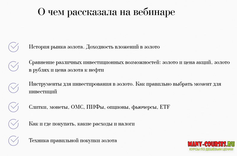Вы находитесь на странице товара «Виктория Сапожникова - Инвестиции в золото (2020)», это материал 2021 года, который, мы надеемся, принесет вам пользу. Скриншоты с платформы на которой расположены материалы вы можете найти выше. В нашем магазине курсы доступны по самым выгодным ценам. Вы можете перейти на оригинальный продажник, после чего принять решение о покупке. Если бы вы покупали у самого автора, то данный курс вам обошелся 250 рублей. Вы получаете этот курс, купив в нашем магазине MANY-COURSES.NET, с огромной скидкой, всего 99 рублей. Обучающий курс входит в рубрику «Инвестиции, Трейдинг, Криптовалюта», вы можете поискать другие сливы курсов в этой рубрике. В нашем магазине Вы найдёте ещё много курсов от автора «Виктория Сапожникова», достаточно ввести в поиск имя автора.
