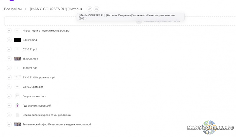Вы находитесь на странице товара «Наталья Смирнова - Чат-канал «Инвестируем вместе»», это материал 2021 года, который, мы надеемся, принесет вам пользу. Данный курс расположен на платформе «Облако Mail».Скриншоты с платформы на которой расположены материалы вы можете найти выше. В нашем магазине курсы доступны по самым выгодным ценам. Вы можете перейти на оригинальный продажник, после чего принять решение о покупке. Вы получаете этот курс, купив в нашем магазине MANY-COURSES.NET, с огромной скидкой, всего 70 рублей. Обучающий курс входит в рубрику «Инвестиции, Трейдинг, Криптовалюта», вы можете поискать другие сливы курсов в этой рубрике. В нашем магазине Вы найдёте ещё много курсов от автора «Наталья Смирнова», достаточно ввести в поиск имя автора.