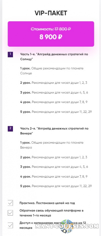 Вы находитесь на странице товара «Люмос 22 / Мара Боронина - Нумерология денежного потока. Пакет VIP», это материал 2022 года, который, мы надеемся, принесет вам пользу. Данный курс расположен на платформе «Яндекс Диск».Скриншоты с платформы на которой расположены материалы вы можете найти выше. В нашем магазине курсы доступны по самым выгодным ценам. Вы можете перейти на оригинальный продажник, после чего принять решение о покупке. Если бы вы покупали у самого автора, то данный курс вам обошелся 8900 рублей. Вы получаете этот курс, купив в нашем магазине MANY-COURSES.NET, с огромной скидкой, всего 220 рублей. Обучающий курс входит в рубрику «Эзотерика и оккультизм / Нумерология», вы можете поискать другие сливы курсов в этой рубрике. В нашем магазине Вы найдёте ещё много курсов от автора «Мара Боронина», достаточно ввести в поиск имя автора.