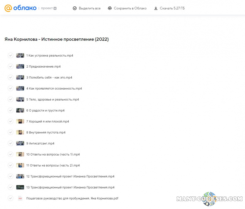 Вы находитесь на странице товара «Яна Корнилова - Истинное просветление», это материал 2022 года, который, мы надеемся, принесет вам пользу. Данный курс расположен на платформе «Облако Mail».Скриншоты с платформы на которой расположены материалы вы можете найти выше. В нашем магазине курсы доступны по самым выгодным ценам. Вы можете перейти на оригинальный продажник, после чего принять решение о покупке. Если бы вы покупали у самого автора, то данный курс вам обошелся 5900 рублей. Вы получаете этот курс, купив в нашем магазине MANY-COURSES.NET, с огромной скидкой, всего 149 рублей. Обучающий курс входит в рубрику «Эзотерика и оккультизм / Психология», вы можете поискать другие сливы курсов в этой рубрике. В нашем магазине Вы найдёте ещё много курсов от автора «Яна Корнилова», достаточно ввести в поиск имя автора.