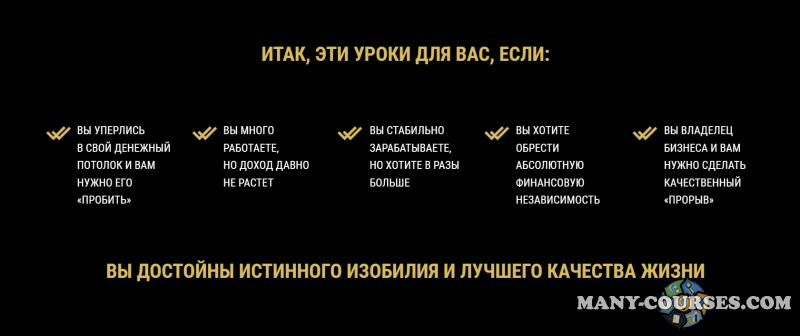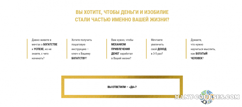 Вам может показаться, что это обычный шаблонный набор практик для личностного роста. Вовсе нет. Это курс, который направлен на ментальное, физическое и энергетические увеличение денежной энергии, основанный на личном опыте эксперта, и опирающийся на последние достижения в науке. Это курс не только о том, как увеличить свой доход, но и про образ жизни.
