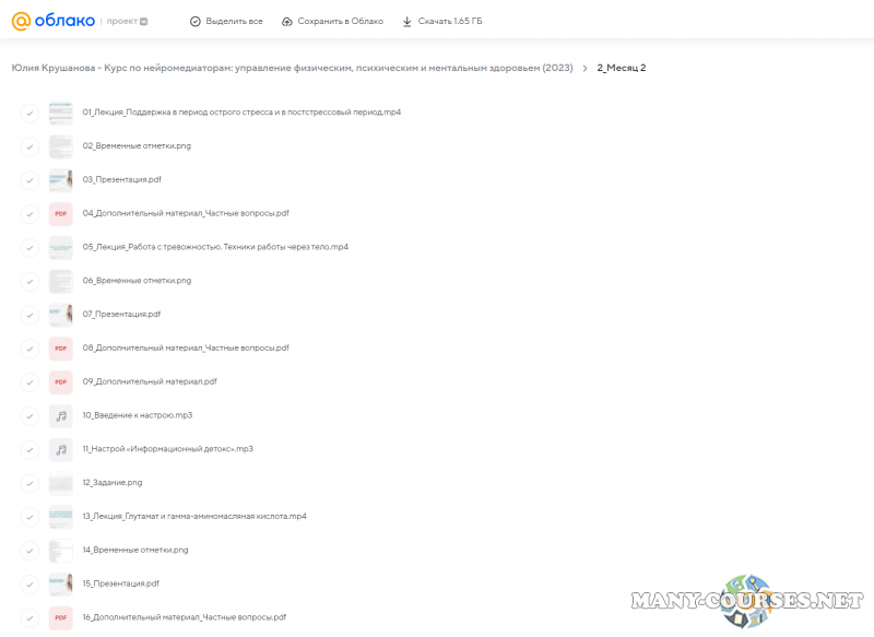 Вы находитесь на странице товара «Юлия Крушанова - Курс по нейромедиаторам: управление физическим, психическим и ментальным здоровьем (2023)», это материал 2023 года, который, мы надеемся, принесет вам пользу. Данный курс расположен на платформе «Облако Mail».Скриншоты с платформы на которой расположены материалы вы можете найти выше. В нашем магазине курсы доступны по самым выгодным ценам. Вы можете перейти на оригинальный продажник, после чего принять решение о покупке. Если бы вы покупали у самого автора, то данный курс вам обошелся 46000 рублей. Вы получаете этот курс, купив в нашем магазине MANY-COURSES.NET, с огромной скидкой, всего 270 рублей. Обучающий курс входит в рубрику «Эзотерика и оккультизм / Психология», вы можете поискать другие сливы курсов в этой рубрике. В нашем магазине Вы найдёте ещё много курсов от автора «Юлия Крушанова», достаточно ввести в поиск имя автора.