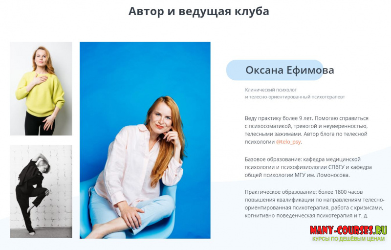 Вы находитесь на странице товара «Оксана Ефимова - Клуб телесной психологии Ноябрь (2021)», это материал 2021 года, который, мы надеемся, принесет вам пользу. Скриншоты с платформы на которой расположены материалы вы можете найти выше. В нашем магазине курсы доступны по самым выгодным ценам. Вы можете перейти на оригинальный продажник, после чего принять решение о покупке. Если бы вы покупали у самого автора, то данный курс вам обошелся 990 рублей. Вы получаете этот курс, купив в нашем магазине MANY-COURSES.NET. Обучающий курс входит в рубрику «Эзотерика и оккультизм / Психология / Скоро», вы можете поискать другие сливы курсов в этой рубрике. В нашем магазине Вы найдёте ещё много курсов от автора «Оксана Ефимова», достаточно ввести в поиск имя автора.