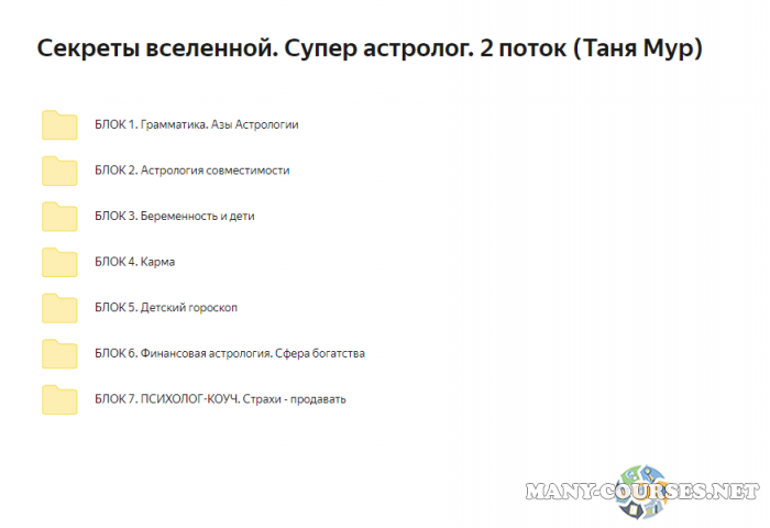 Вы находитесь на странице товара «Таня Мур - Секреты вселенной. Супер астролог. 2 поток», это материал 2023 года, который, мы надеемся, принесет вам пользу. Данный курс расположен на платформе «Яндекс Диск».Скриншоты с платформы на которой расположены материалы вы можете найти выше. В нашем магазине курсы доступны по самым выгодным ценам. Вы можете перейти на оригинальный продажник, после чего принять решение о покупке. Вы получаете этот курс, купив в нашем магазине MANY-COURSES.NET, с огромной скидкой, всего 1100 рублей. Обучающий курс входит в рубрику «Эзотерика и оккультизм», вы можете поискать другие сливы курсов в этой рубрике. В нашем магазине Вы найдёте ещё много курсов от автора «Таня Мур», достаточно ввести в поиск имя автора.