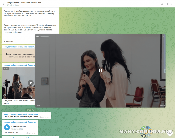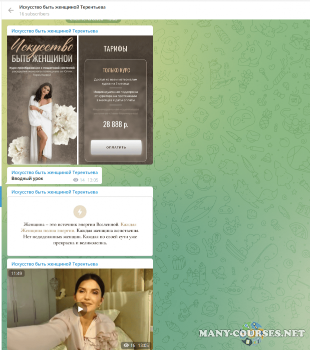 Вы находитесь на странице товара «Юлия Терентьева - Искусство быть женщиной. Тариф Только курс», это материал 2023 года, который, мы надеемся, принесет вам пользу. Данный курс расположен на платформе «Канал Telegram».Скриншоты с платформы на которой расположены материалы вы можете найти выше. В нашем магазине курсы доступны по самым выгодным ценам. Вы можете перейти на оригинальный продажник, после чего принять решение о покупке. Если бы вы покупали у самого автора, то данный курс вам обошелся 28888 рублей. Вы получаете этот курс, купив в нашем магазине MANY-COURSES.NET, с огромной скидкой, всего 1690 рублей. Обучающий курс входит в рубрику «Эзотерика и оккультизм», вы можете поискать другие сливы курсов в этой рубрике. В нашем магазине Вы найдёте ещё много курсов от автора «Юлия Терентьева», достаточно ввести в поиск имя автора.