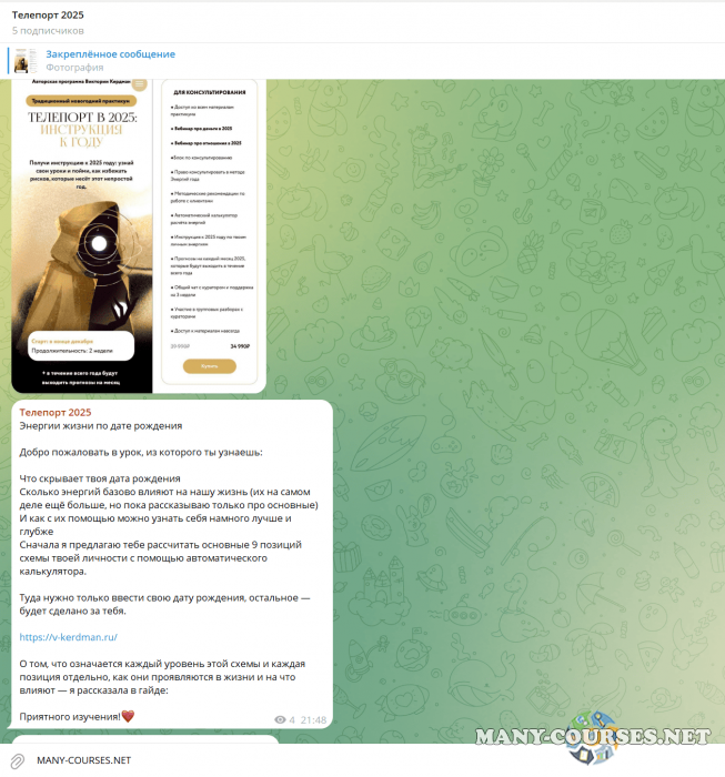 Вы находитесь на странице товара «Виктория Кердман - Телепорт в 2025. Тариф Для консультирования», это материал 2025 года, который, мы надеемся, принесет вам пользу. Данный курс расположен на платформе «Канал Telegram».Скриншоты с платформы на которой расположены материалы вы можете найти выше. В нашем магазине курсы доступны по самым выгодным ценам. Если бы вы покупали у самого автора, то данный курс вам обошелся 34990 рублей. Вы получаете этот курс, купив в нашем магазине MANY-COURSES.NET, с огромной скидкой, всего 990 рублей. Обучающий курс входит в рубрику «Эзотерика и оккультизм», вы можете поискать другие сливы курсов в этой рубрике. В нашем магазине Вы найдёте ещё много курсов от автора «Виктория Кердман», достаточно ввести в поиск имя автора.