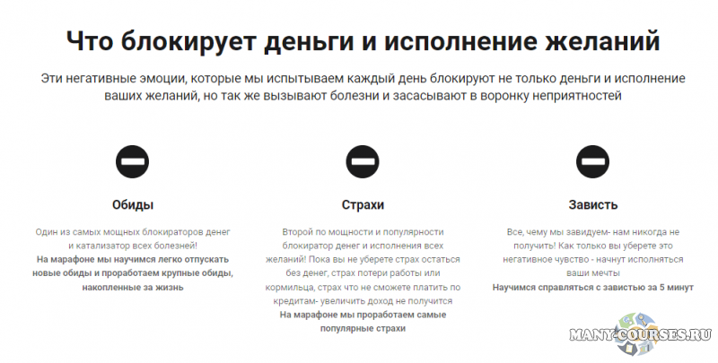 - Страхи. Второй по мощности и популярности блокиратор денег и исполнения всех желаний! Пока вы не уберете страх остаться без денег, страх потери работы или кормильца, страх что не сможете платить по кредитам- увеличить доход не получится. На марафоне мы проработаем самые популярные страхи