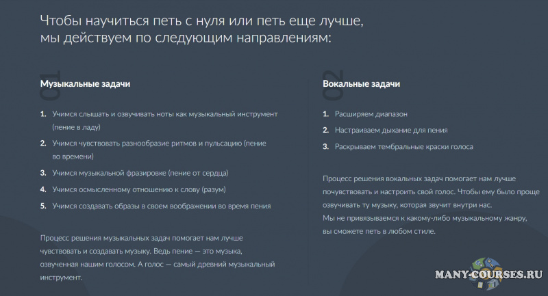 Процесс решения вокальных задач помогает нам лучше почувствовать и настроить свой голос. Чтобы ему было проще озвучивать ту музыку, которая звучит внутри нас. Мы не привязываемся к какому-либо музыкальному жанру, вы сможете петь в любом стиле.