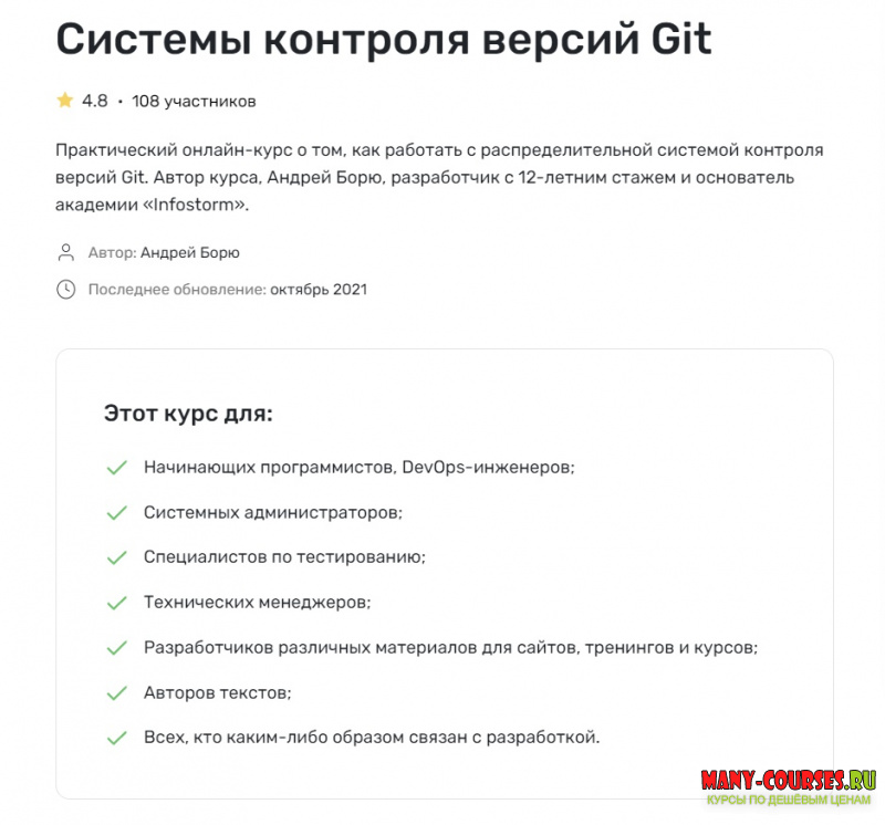 Вы находитесь на странице товара «Edston / Андрей Борю - Системы контроля версий Git», это материал 2021 года, который, мы надеемся, принесет вам пользу. Данный курс расположен на платформе «Облако Mail».Скриншоты с платформы на которой расположены материалы вы можете найти выше. В нашем магазине курсы доступны по самым выгодным ценам. Вы можете перейти на оригинальный продажник, после чего принять решение о покупке. Если бы вы покупали у самого автора, то данный курс вам обошелся 999 рублей. Вы получаете этот курс, купив в нашем магазине MANY-COURSES.NET, с огромной скидкой, всего 70 рублей. Обучающий курс входит в рубрику «Программирование», вы можете поискать другие сливы курсов в этой рубрике. В нашем магазине Вы найдёте ещё много курсов от автора «Edston / Андрей Борю», достаточно ввести в поиск имя автора.