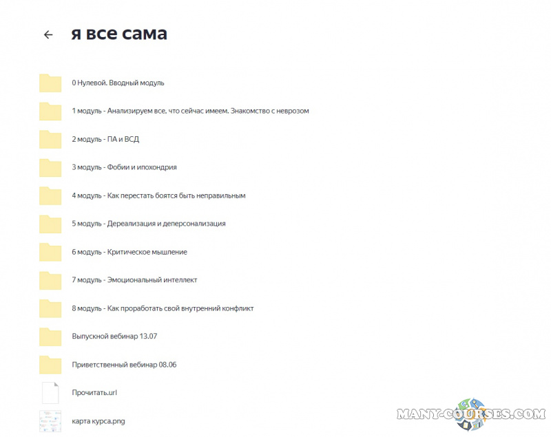 Вы получите: материалы авторского онлайн-курса (9 контентных модулей) Тариф "За ручку из невроза с психологом" . Курс будет в формате коротких видео-уроков без воды и лишней информации. К урокам будут идти домашние задание и дополнительные материалы