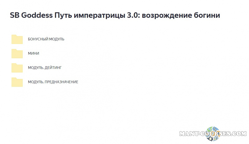 Вы находитесь на странице товара «SB Goddess - Путь императрицы 3.0: возрождение богини. Тариф - Продвинутый», это материал 2022 года, который, мы надеемся, принесет вам пользу. Данный курс расположен на платформе «Яндекс Диск».Скриншоты с платформы на которой расположены материалы вы можете найти выше. В нашем магазине курсы доступны по самым выгодным ценам. Вы можете перейти на оригинальный продажник, после чего принять решение о покупке. Если бы вы покупали у самого автора, то данный курс вам обошелся 33900 рублей. Вы получаете этот курс, купив в нашем магазине MANY-COURSES.NET, с огромной скидкой, всего 550 рублей. Обучающий курс входит в рубрику «Психология / Эзотерика и оккультизм», вы можете поискать другие сливы курсов в этой рубрике. В нашем магазине Вы найдёте ещё много курсов от автора «SB Goddess», достаточно ввести в поиск имя автора.