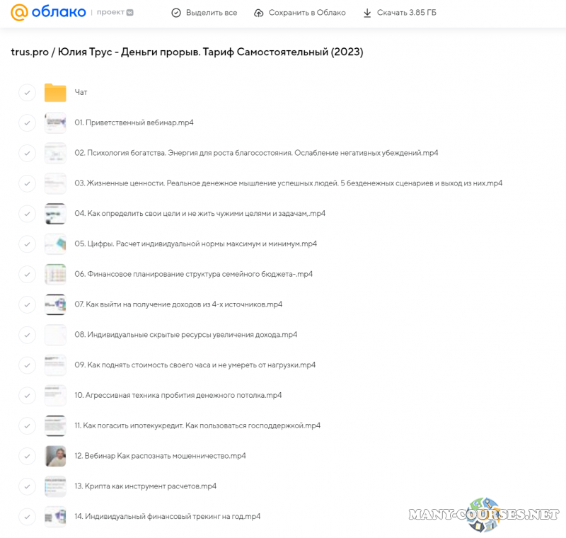 Вы находитесь на странице товара «trus.pro / Юлия Трус - Деньги прорыв. Тариф Самостоятельный (2023)», это материал 2023 года, который, мы надеемся, принесет вам пользу. Данный курс расположен на платформе «Облако Mail».Скриншоты с платформы на которой расположены материалы вы можете найти выше. В нашем магазине курсы доступны по самым выгодным ценам. Вы можете перейти на оригинальный продажник, после чего принять решение о покупке. Если бы вы покупали у самого автора, то данный курс вам обошелся 23000 рублей. Вы получаете этот курс, купив в нашем магазине MANY-COURSES.NET, с огромной скидкой, всего 149 рублей. Обучающий курс входит в рубрику «Психология / Саморазвитие и мотивация», вы можете поискать другие сливы курсов в этой рубрике. В нашем магазине Вы найдёте ещё много курсов от автора «Юлия Трус», достаточно ввести в поиск имя автора.