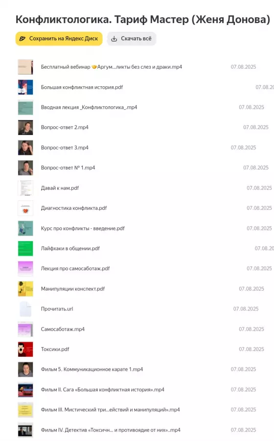 Вы находитесь на странице товара «Женя Донова - Конфликтологика. Тариф Мастер», это материал 2024 года, который, мы надеемся, принесет вам пользу. Данный курс расположен на платформе «Яндекс Диск».Скриншоты с платформы на которой расположены материалы вы можете найти выше. В нашем магазине курсы доступны по самым выгодным ценам. Если бы вы покупали у самого автора, то данный курс вам обошелся 10990 рублей. Вы получаете этот курс, купив в нашем магазине MANY-COURSES.NET, с огромной скидкой, всего 390 рублей. Обучающий курс входит в рубрику «Саморазвитие и мотивация / Психология», вы можете поискать другие сливы курсов в этой рубрике. В нашем магазине Вы найдёте ещё много курсов от автора «Женя Донова», достаточно ввести в поиск имя автора.