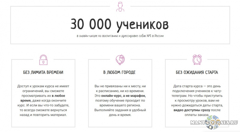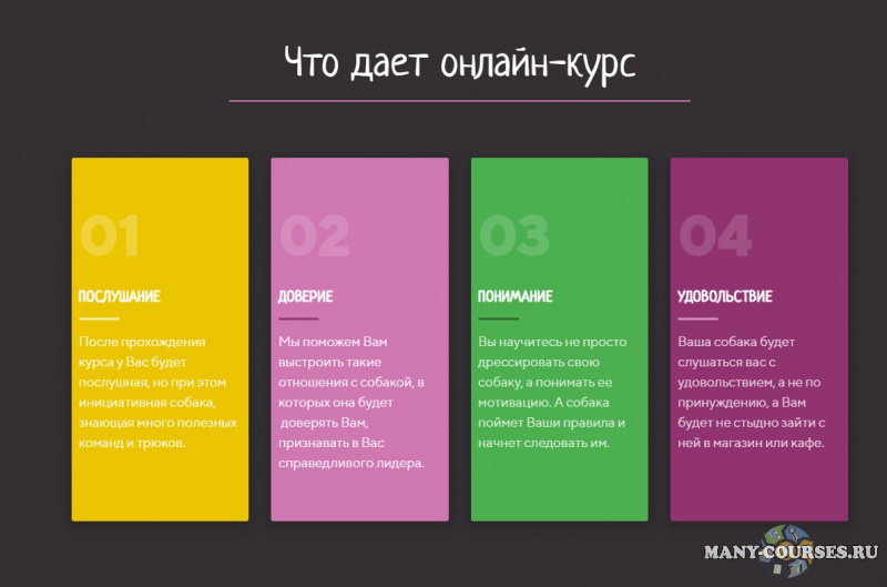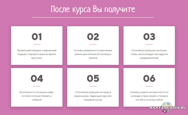 Практика — в каждом уроке вы получаете четкие задания и видео, где показываем,как проходит обучение, благодаря чему вы видите все маленькие нюансы,тонкости работы, ошибки и сможете быстро и эффективно обучить свою собаку.