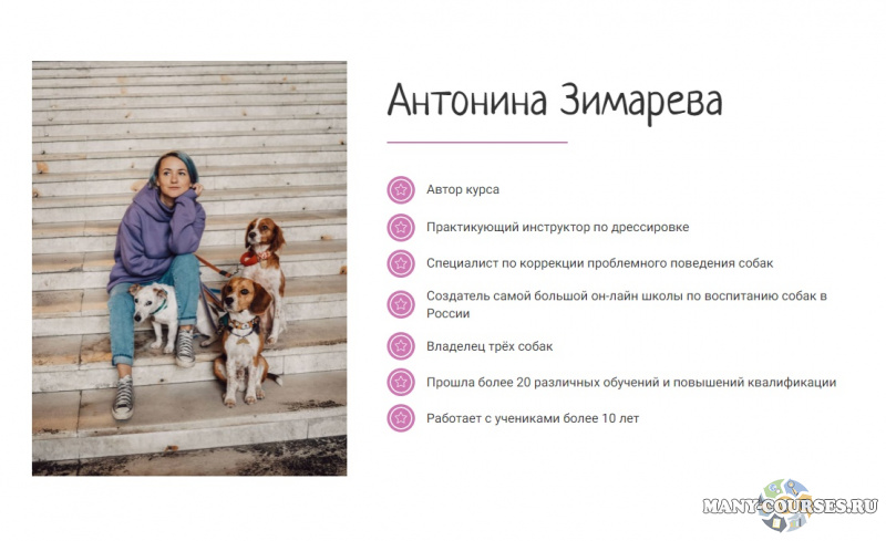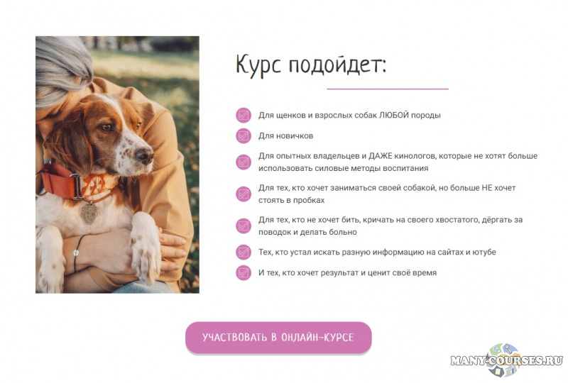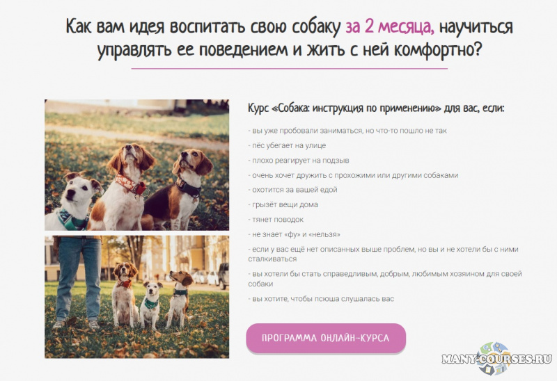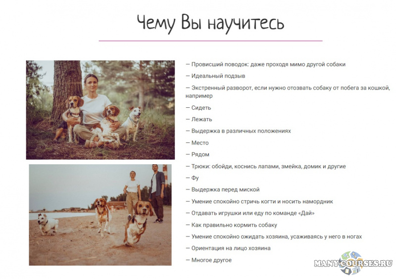 Курс для собак всех возрастов и любой породы. Свыше 70-ти видео-уроков, пройдя которые, вы научите собаку базовым командам и трюкам. В данном онлайн-курсе есть все, что нужно знать о воспитании собаки.