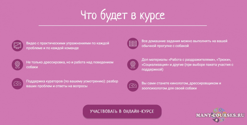 - Доп материалы «Работа с раздражителями», «Трюки», «Социализация» и другие (при выборе пакета участия с поддержкой)