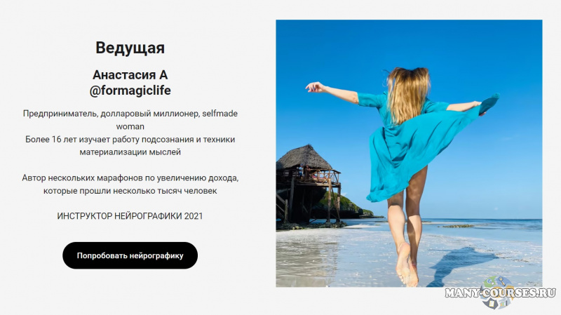 Вы находитесь на странице товара «Анастасия Анисимова / formagiclife - Нейрорецепт (2021)», это материал 2021 года, который, мы надеемся, принесет вам пользу. Скриншоты с платформы на которой расположены материалы вы можете найти выше. В нашем магазине курсы доступны по самым выгодным ценам. Вы можете перейти на оригинальный продажник, после чего принять решение о покупке. Если бы вы покупали у самого автора, то данный курс вам обошелся 1111 рублей. Вы получаете этот курс, купив в нашем магазине MANY-COURSES.NET, с огромной скидкой, всего 99 рублей. Обучающий курс входит в рубрику «Саморазвитие и мотивация / Психология», вы можете поискать другие сливы курсов в этой рубрике. В нашем магазине Вы найдёте ещё много курсов от автора «Анастасия Анисимова», достаточно ввести в поиск имя автора.