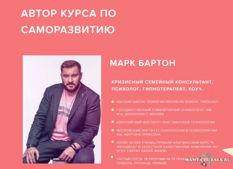 Вы находитесь на странице товара «Марк Бартон - Я - женщина 2.0 .Тариф «Расширенный» (2021)», это материал 2021 года, который, мы надеемся, принесет вам пользу. Данный курс расположен на платформе «Облако Mail».Скриншоты с платформы на которой расположены материалы вы можете найти выше. В нашем магазине курсы доступны по самым выгодным ценам. Вы можете перейти на оригинальный продажник, после чего принять решение о покупке. Если бы вы покупали у самого автора, то данный курс вам обошелся 24000 рублей. Вы получаете этот курс, купив в нашем магазине MANY-COURSES.NET, с огромной скидкой, всего 249 рублей. Обучающий курс входит в рубрику «Саморазвитие и мотивация / Эзотерика и оккультизм», вы можете поискать другие сливы курсов в этой рубрике. В нашем магазине Вы найдёте ещё много курсов от автора «Марк Бартон», достаточно ввести в поиск имя автора.