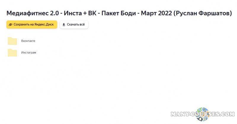 Вы находитесь на странице товара «Руслан Фаршатов - Медиафитнес 2.0 - Инста + ВК - Пакет Боди», это материал 2022 года, который, мы надеемся, принесет вам пользу. Данный курс расположен на платформе «Яндекс Диск».Скриншоты с платформы на которой расположены материалы вы можете найти выше. В нашем магазине курсы доступны по самым выгодным ценам. Вы получаете этот курс, купив в нашем магазине MANY-COURSES.NET, с огромной скидкой, всего 790 рублей. Обучающий курс входит в рубрику «SEO и SMM / Вконтакте (VK) / Instagram / Telegram», вы можете поискать другие сливы курсов в этой рубрике. В нашем магазине Вы найдёте ещё много курсов от автора «Руслан Фаршатов», достаточно ввести в поиск имя автора.