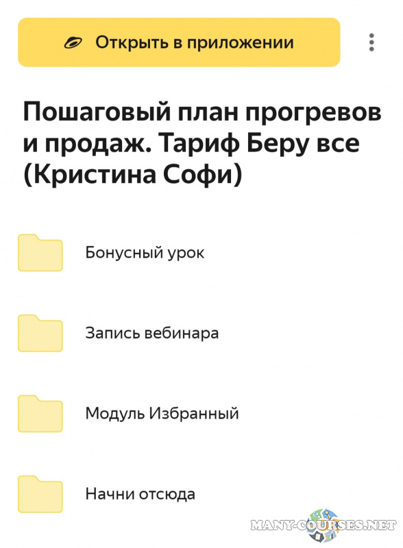 Вы находитесь на странице товара «Кристина Софи - Пошаговый план прогревов и продаж. Тариф Беру все», это материал 2023 года, который, мы надеемся, принесет вам пользу. Данный курс расположен на платформе «Яндекс Диск».Скриншоты с платформы на которой расположены материалы вы можете найти выше. В нашем магазине курсы доступны по самым выгодным ценам. Вы получаете этот курс, купив в нашем магазине MANY-COURSES.NET, с огромной скидкой, всего 490 рублей. Обучающий курс входит в рубрику «SEO и SMM / Бизнес, менеджмент, продажи», вы можете поискать другие сливы курсов в этой рубрике. В нашем магазине Вы найдёте ещё много курсов от автора «Кристина Софи», достаточно ввести в поиск имя автора.