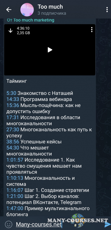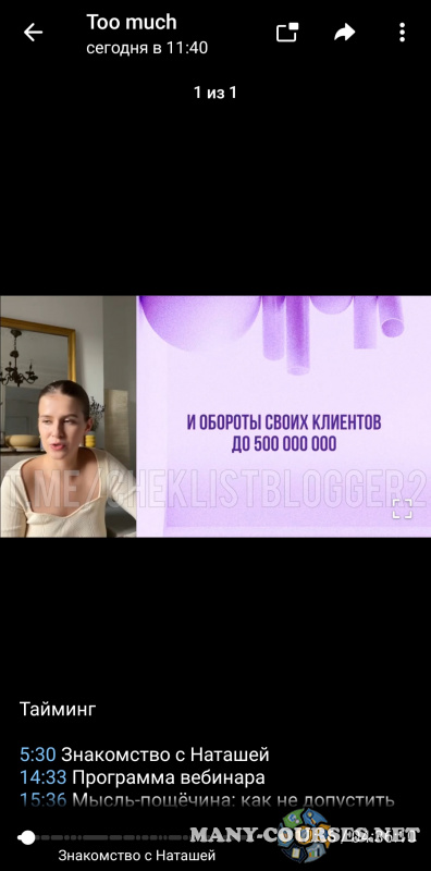 Вы находитесь на странице товара «Наташа Панфилова - Too much маркетинг (2023)», это материал 2023 года, который, мы надеемся, принесет вам пользу. Данный курс расположен на платформе «Канал Telegram».Скриншоты с платформы на которой расположены материалы вы можете найти выше. В нашем магазине курсы доступны по самым выгодным ценам. Вы можете перейти на оригинальный продажник, после чего принять решение о покупке. Если бы вы покупали у самого автора, то данный курс вам обошелся 15000 рублей. Вы получаете этот курс, купив в нашем магазине MANY-COURSES.NET, с огромной скидкой, всего 690 рублей. Обучающий курс входит в рубрику «SEO и SMM», вы можете поискать другие сливы курсов в этой рубрике. В нашем магазине Вы найдёте ещё много курсов от автора «Наташа Панфилова», достаточно ввести в поиск имя автора.