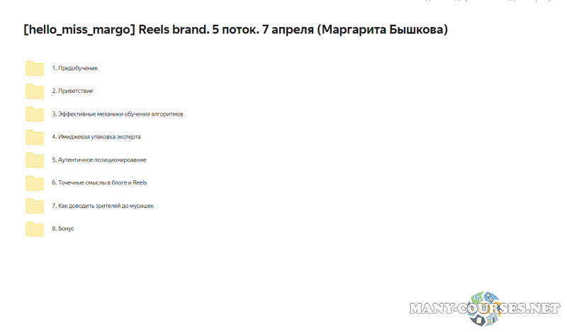 Вы находитесь на странице товара «hello_miss_margo / Маргарита Бышкова - Reels brand. 5 поток. Тариф Premium», это материал 2023 года, который, мы надеемся, принесет вам пользу. Данный курс расположен на платформе «Яндекс Диск».Скриншоты с платформы на которой расположены материалы вы можете найти выше. В нашем магазине курсы доступны по самым выгодным ценам. Вы получаете этот курс, купив в нашем магазине MANY-COURSES.NET, с огромной скидкой, всего 620 рублей. Обучающий курс входит в рубрику «SEO и SMM / Курсы по Reels », вы можете поискать другие сливы курсов в этой рубрике. В нашем магазине Вы найдёте ещё много курсов от автора «Маргарита Бышкова», достаточно ввести в поиск имя автора.