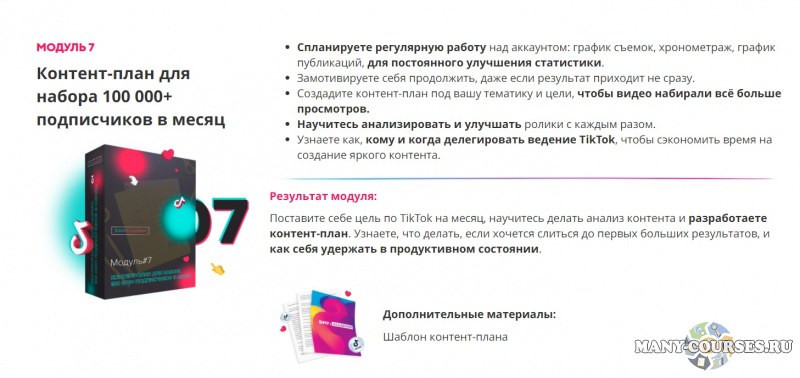 Результат модуля - Поставите себе цель по TikTok на месяц, научитесь делать анализ контента и разработаете контент-план. Узнаете, что делать, если хочется слиться до первых больших результатов, и как себя удержать в продуктивном состоянии.